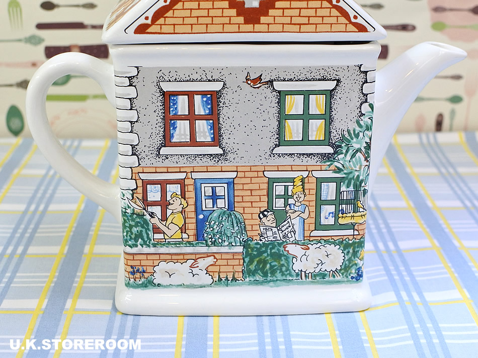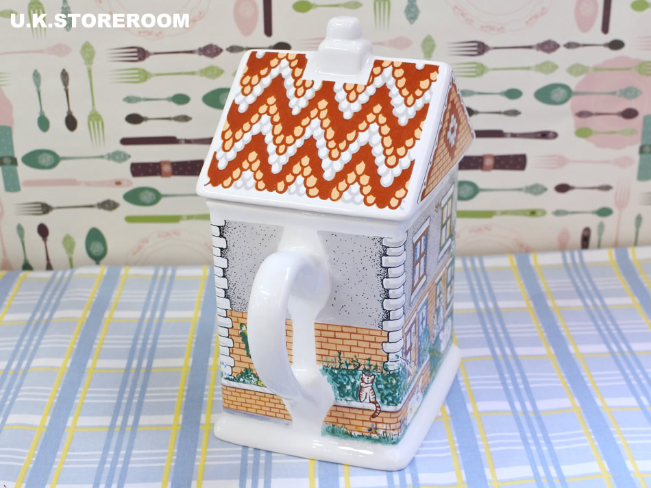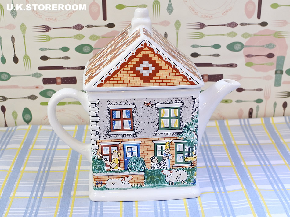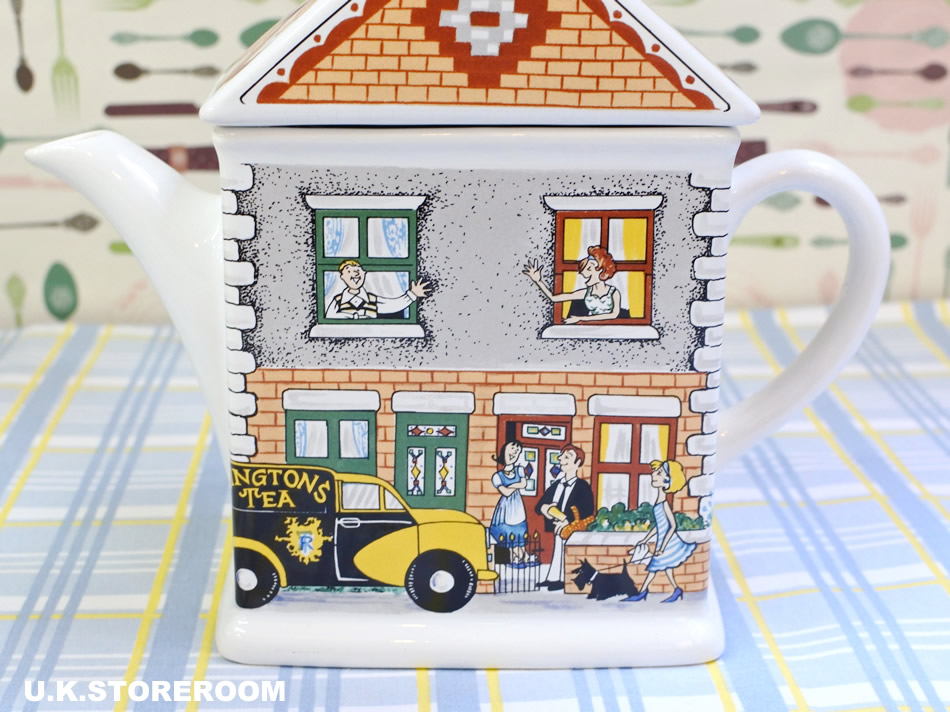 イギリス・ウエイド社がリントンズのためにデザインした、コレクターズティーポットです。ハウス型のティーポットにはちょうどリントンズの紅茶が配達されたシーンが描かれています。ハウス型のコレクターズティーポットのシリーズは年代別に、1920年、1950年代、1960年代、1980年代の4つのバージョンで展開されています。このティーポットは1960年代。リントンズの地元、ニューカッスルのフラットにお届けにあがったようです。ドライバーの男性がバスケットから出した紅茶を女性に渡しています。裏庭には羊たちが休んでいます。ポット本体とフタに貫入がありますが、全体的にツヤもあり、状態良好です。イギリス製。