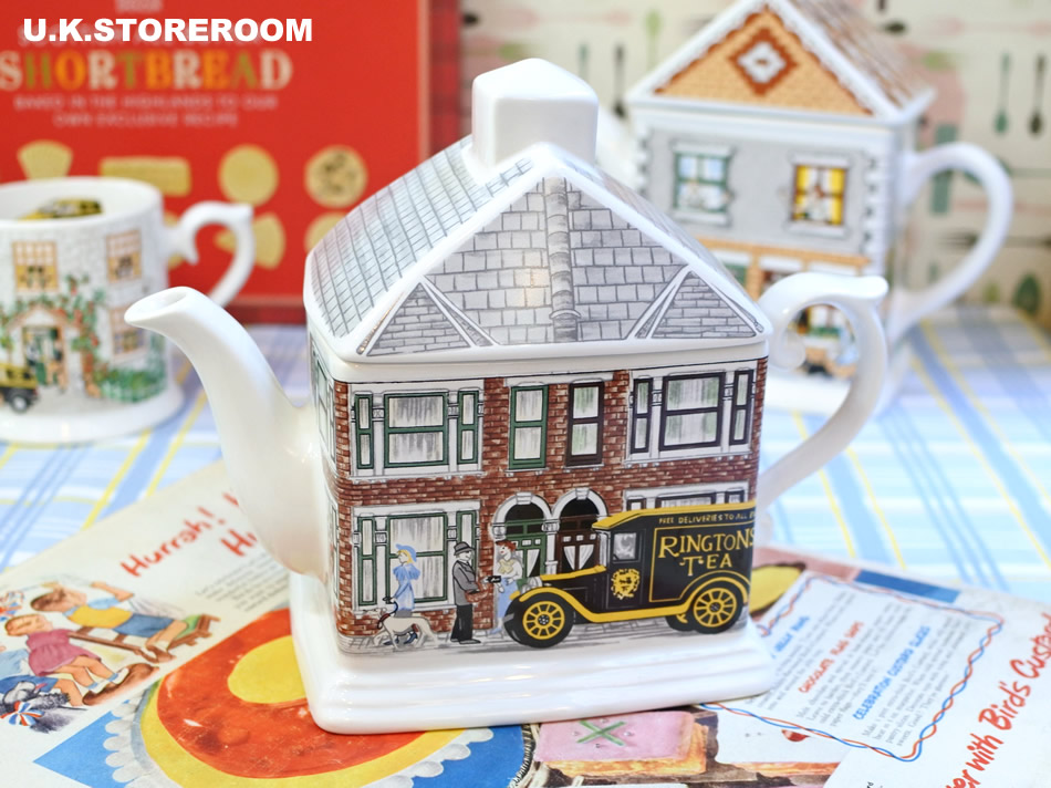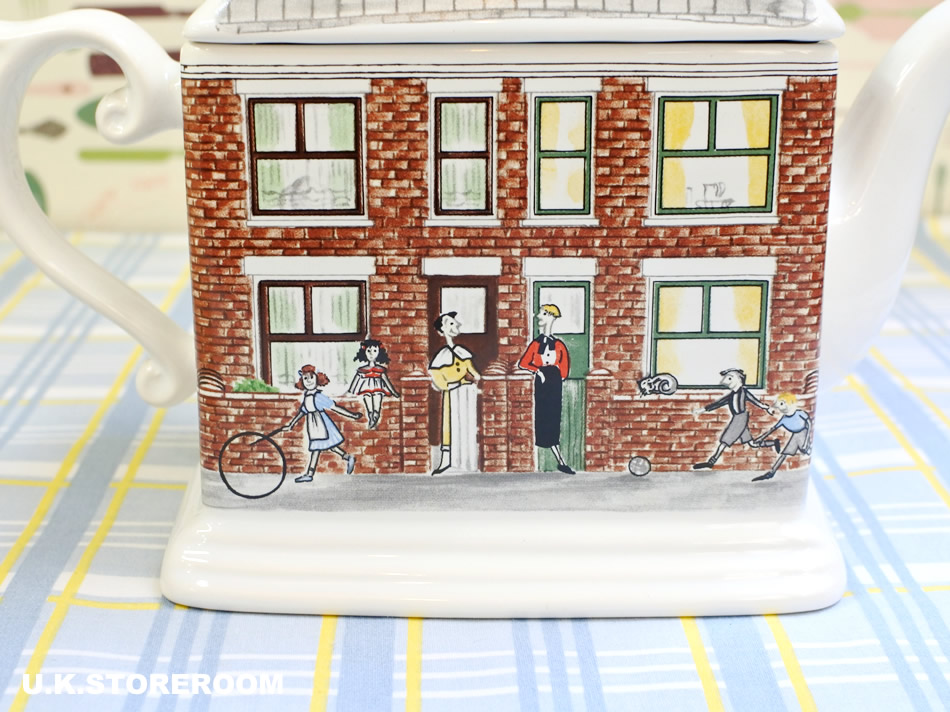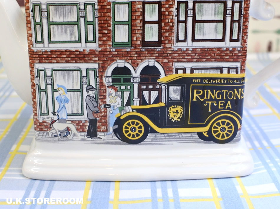 イギリス・ウエイド社がリントンズのためにデザインした、コレクターズティーポットです。ハウス型のティーポットにはちょうどリントンズの紅茶が配達されたシーンが描かれています。ハウス型のコレクターズティーポットのシリーズは年代別に、1920年、1950年代、1960年代、1980年代の4つのバージョンで展開されています。このティーポットは1950年代。紅茶缶のデザインになっているクラシカルな車でご婦人にお届けにあがったようです。レンガ造りの通りの前では子供たちが遊んでいます。注ぎ口の裏側に製作時の小さな膨らみがひとつとフタに浅い貫入が少々ありますが、使用感はあまりなく、全体的にツヤもあり、状態良好です。イギリス製。