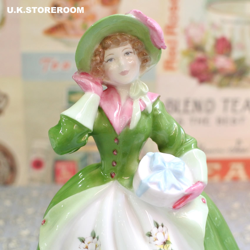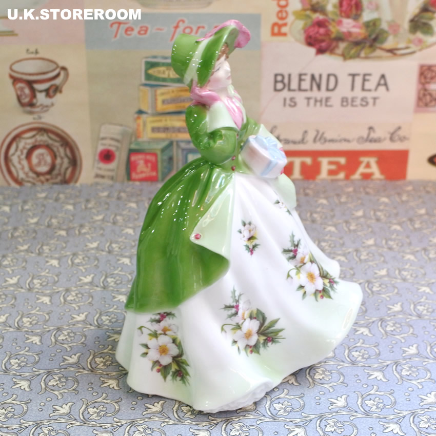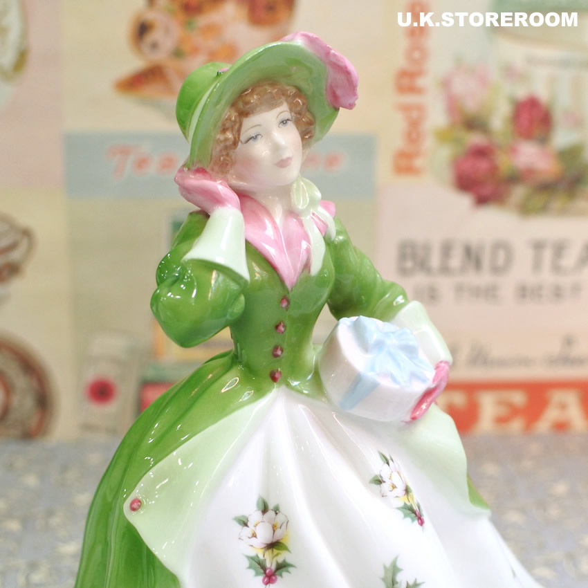 ロイヤルウースターから1995年に9500体限定で製造された『Sweet Holly』のフィギュリン。お花の名前がついたレディのシリーズでスミレやローズ、スィートピーなど、可憐なラインナップで展開されました。どのレディも可愛い小花柄のドレスを着て、ブーケやバスケットを持っています。ヒイラギのレディは、明るいグリーンのドレスを着て、片手にプレゼントを持ち、ポーズをとっています。ピンクの襟やグローブ、帽子の羽根飾りがファッションのポイントになっています。ひびや欠けなどもなく、ツヤもあり、とてもきれいな状態です。