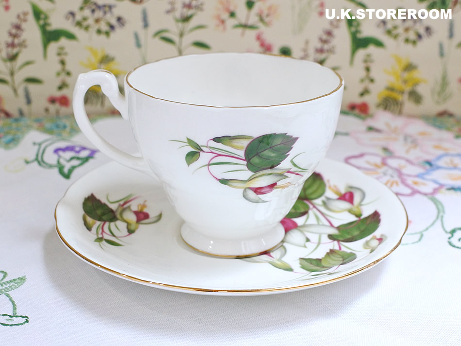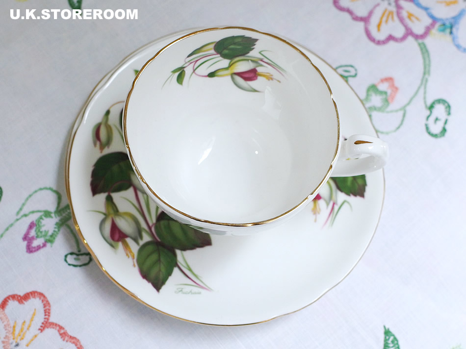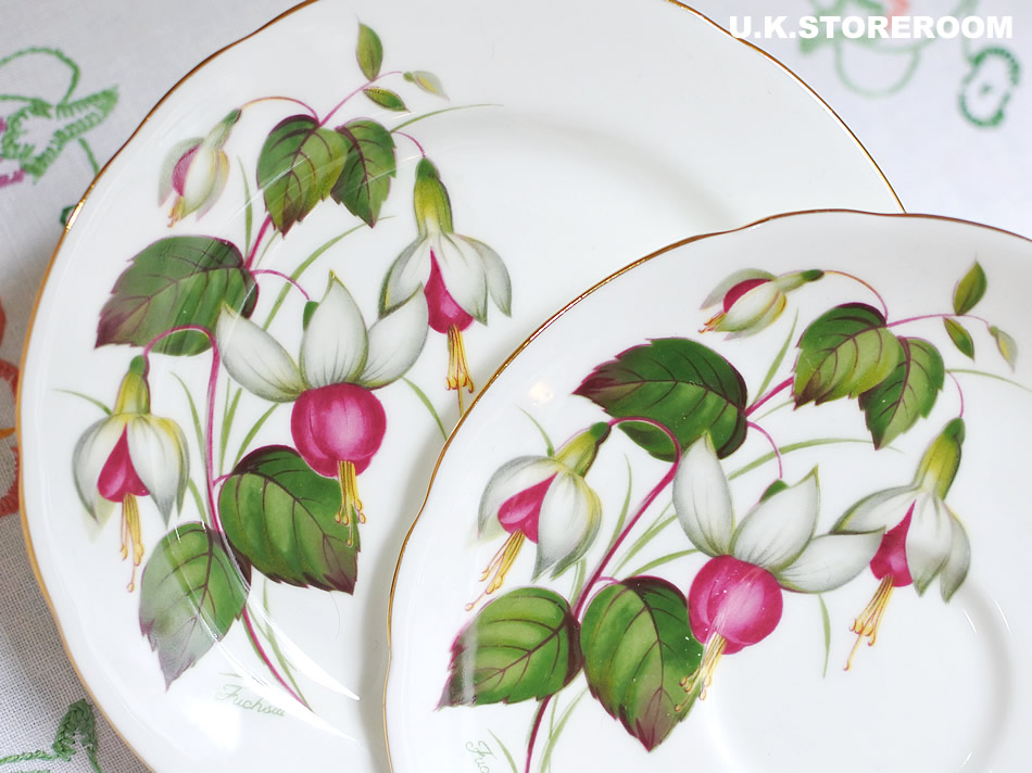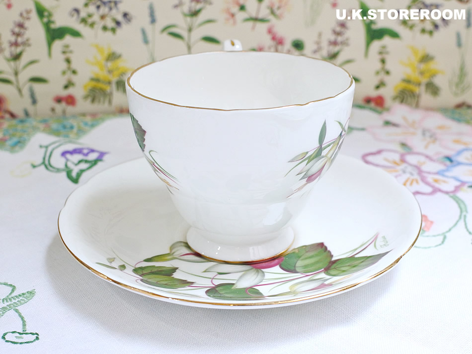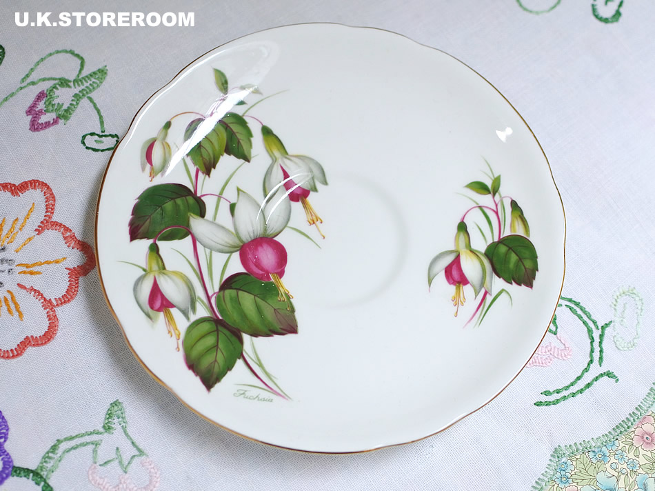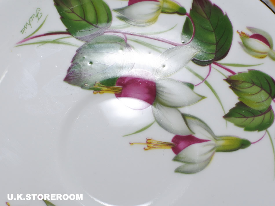 華やかな赤紫色のフクシアが大胆にプリントされた、ハマースレイのティートリオです。垂れ下がるベルのような花姿がイヤリングに似ていることから、別名で『Lady's eardrops(レディー・イヤドロップス)』とも呼ばれ、イギリスではガーデンフラワーとして親しまれています。バックスタンプは王冠にどんぐりのマークが入った1950年代頃のもの。厚めのボーンチャイナ製で、比較的しっかりとした造りです。画像15マ枚目で確認できるように斜めから見るとソーサーの一部表面にプツプツとした箇所(焼成時のものです)がありますが、全体的に使用感はほとんどなく、とてもきれいな状態です。
