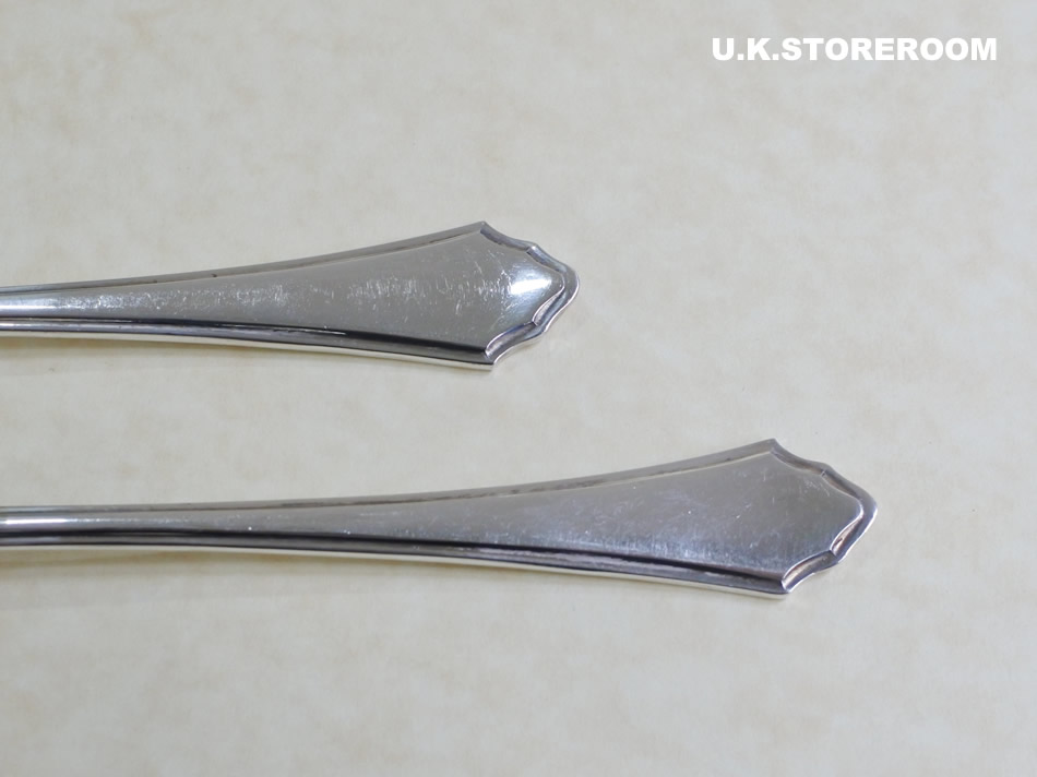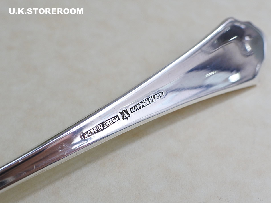 ロンドンの高級宝飾店「マッピン&ウェッブ」のシルバープレート製ディナーフォークです。1775年に銀製品メーカーとして創業したマッピン&ウェッブの銀製品は、高品質で高い人気を誇っています。表面に細かい使用跡がありますが、疲れた感じはなく、状態良好です(画像では実物よりも使用跡が目立って写ってしまいます)。GS047のナイフと対になる同じデザインです。*価格は1本の価格です。