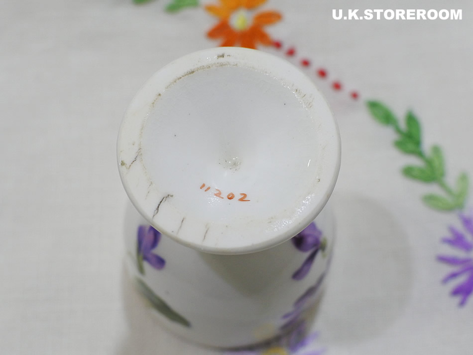 ハマースレイを代表するスミレ柄『ヴィクトリアンバイオレット』のエッグスタンドです。1920年代〜1930年代頃のもので、刻印はなく、パターンナンバー「11202」と赤字で書かれています。エッグスタンドAはプリントに葉っぱが1枚入っています。製作時の茶点やプリント飛び、縁の金彩に擦れがありますが、全体的に状態良好です。磁器製。