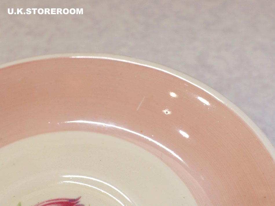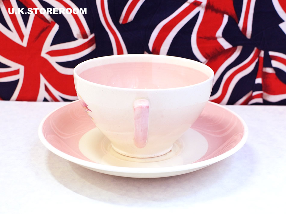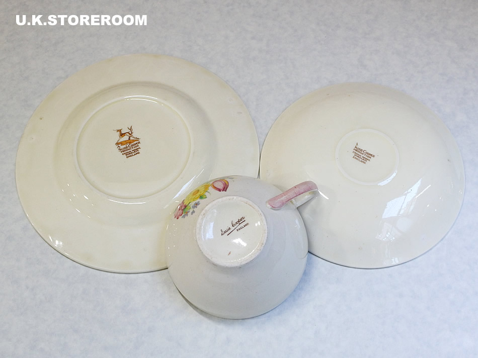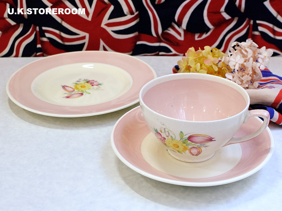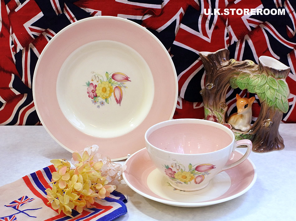 スージーの代表的な作品のひとつ「スワンシースプレイ」のティートリオです。こちらのトリオはグラデーションパターンではなく、カップは内側がべた塗り、ソーサーとケーキプレートは太いボーダーでピンク色が塗られています。ソーサーのシェイプはリムがなく、BBプレートにような滑らかにせりあがっています。製作時の茶点が少々とケーキプレートの中央部分に貫入が入っておりますが、全体的に使用感は少なく、状態良好です。