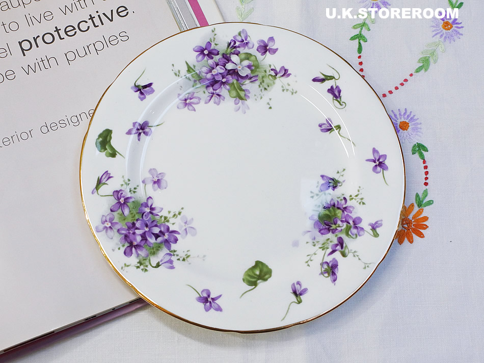 『ヴィクトリアンバイオレット』シリーズの8インチサイズのデザートプレートです。バックスタンプは緑色の筆記体で1940〜50年代頃のものが入っています。縁はゆるやかなリンカ状になっており、エンボスは入っていないタイプです。メインのブーケには白いスミレが一輪入っており、まわりに飛んだお花や葉っぱや蕾など、それぞれのプレートで小さなリトグラフの入り方が微妙に違っています。製作時の薄いプリント飛びや茶点、斜めから見ると浅いスクラッチがほんの少々ありますが、全体的に使用感は少なく、ツヤもあり、とてもきれいな状態です。ボーンチャイナ製。