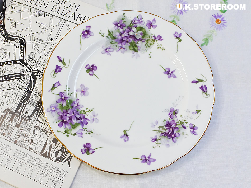 『ヴィクトリアンバイオレット』シリーズの8インチサイズのデザートプレートです。バックスタンプは緑色の筆記体で1940〜50年代頃のものが入っています。縁はゆるやかなリンカ状になっており、エンボスは入っていないタイプです。メインのブーケには白いスミレが一輪入っており、まわりに飛んだお花や葉っぱや蕾など、それぞれのプレートで小さなリトグラフの入り方が微妙に違っています。画像6,7枚目で確認できるように金彩縁に製作時の小さな凹みがひとつありますが正面からは見えない位置で、気にならない程度です。製作時の薄いプリント飛びや茶点、斜めから見ると浅いスクラッチがほんの少々ありますが、全体的に使用感は少なく、ツヤもあり、とてもきれいな状態です。ボーンチャイナ製。