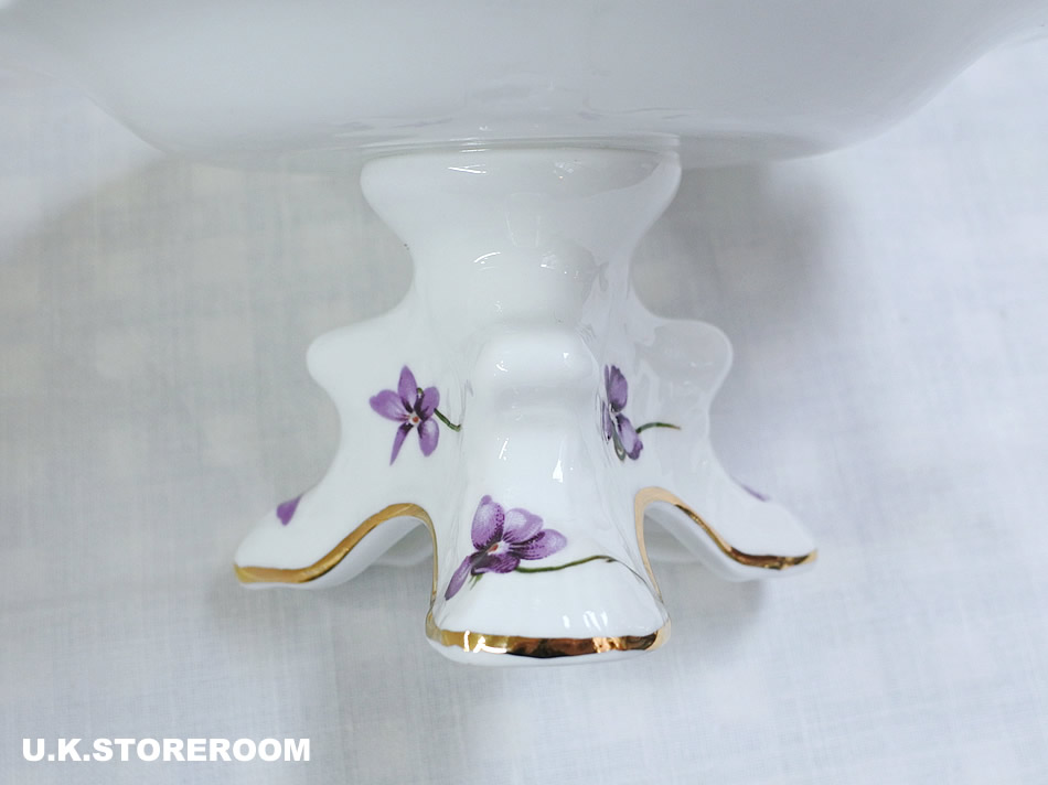 あまり見かけることが少ない『ヴィクトリアンバイオレット』のミニコンポートです。プレート部分は上から見るとお花の形になっていて、縁はエンボスで模様が入っています。全体的に使用感はほとんどなく、状態良好です。