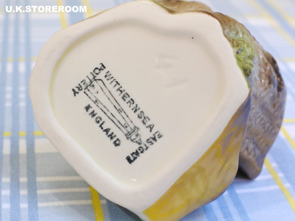 イーストゲートポタリーの動物花器シリーズ「ファウナ」の小さなベースです。1967年にホーンジーは「ファウナ」シリーズの製造を終了し、その後イーストゲートポタリーに引き継ぎされました。ユニークなデザインや素朴な雰囲気はホーンジー社製と同じく、思わず笑みがこぼれてしまう可愛さです。製作時のプリント飛びが少々ありますが、全体的にツヤもあり、きれいな状態です。