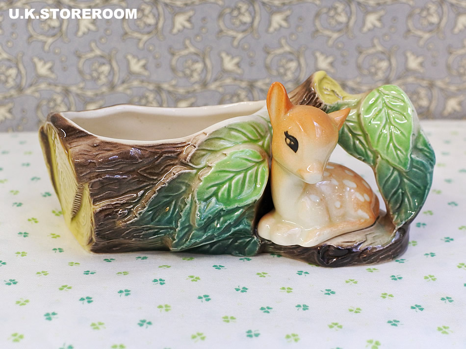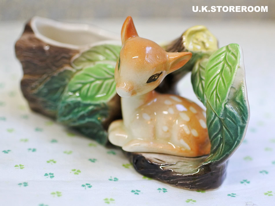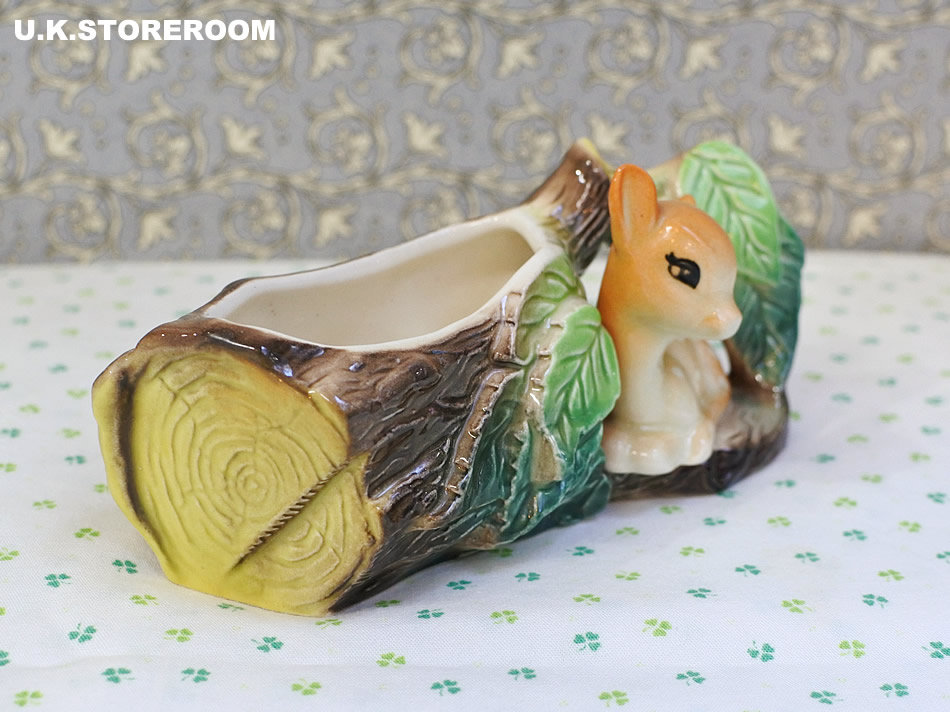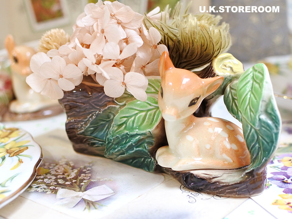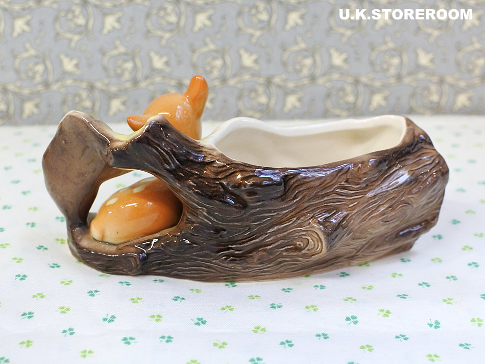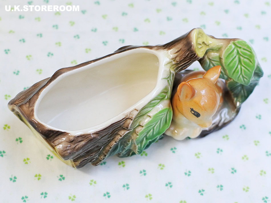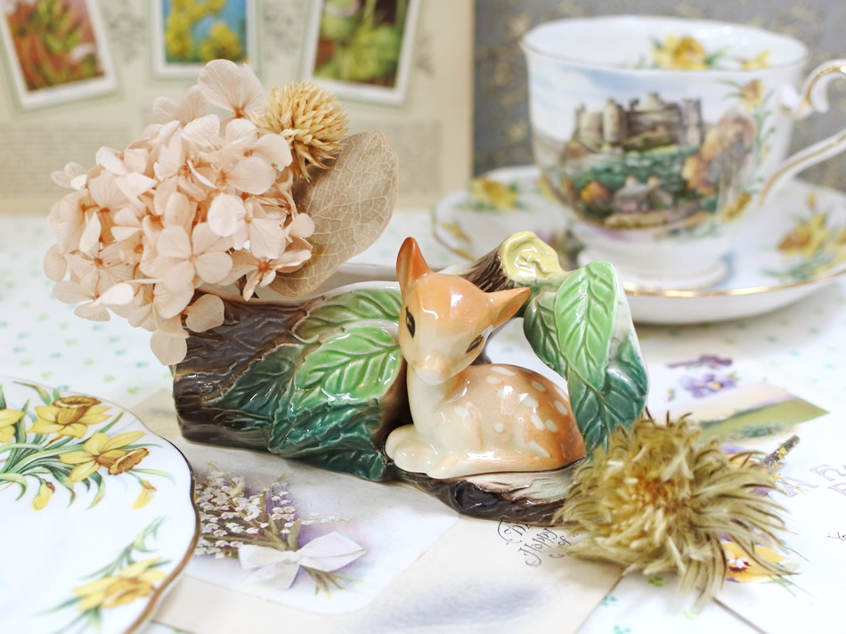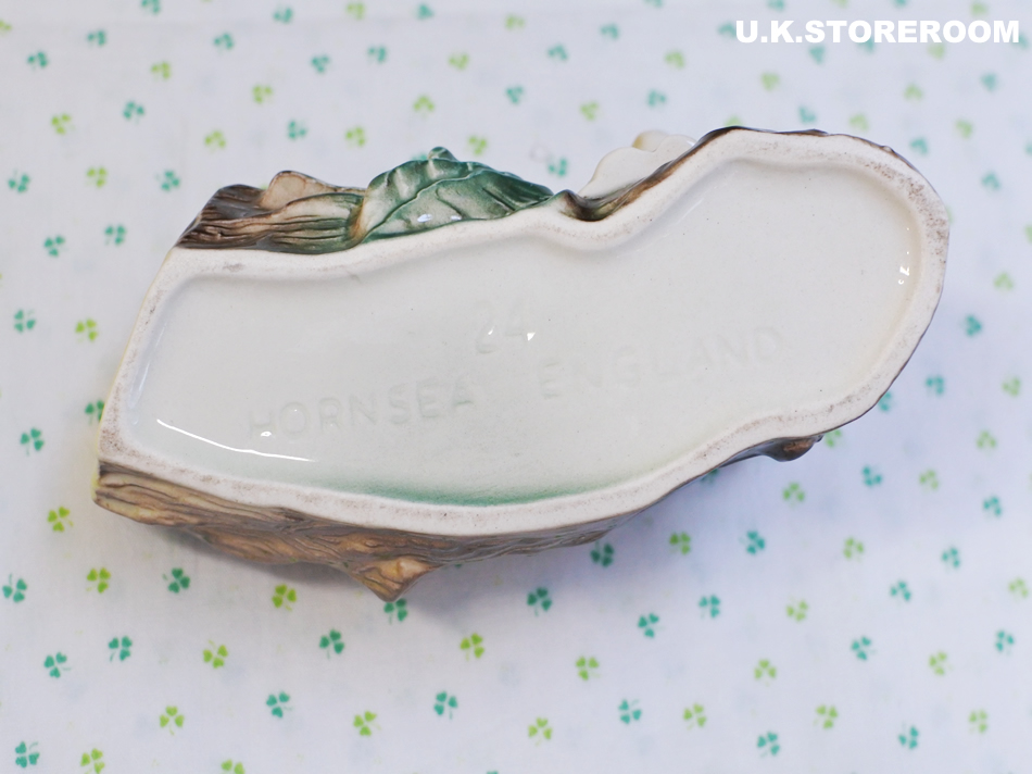 ホーンジーの動物花器シリーズ「ファウナロイヤル」のポジーベースです。1960年代当時に人気を博した、小鹿、リス、ウサギの動物シリーズで、高さ約5cmほどの小さなものから大型のウォータージャグまで豊富に展開されました。このベースは全長約13cm。ベースの端に小鹿が座っています。名刺サイズの小さなカード入れとしても活用できそうです。全体的にツヤもあり、きれいな状態です。